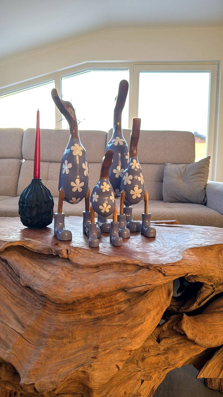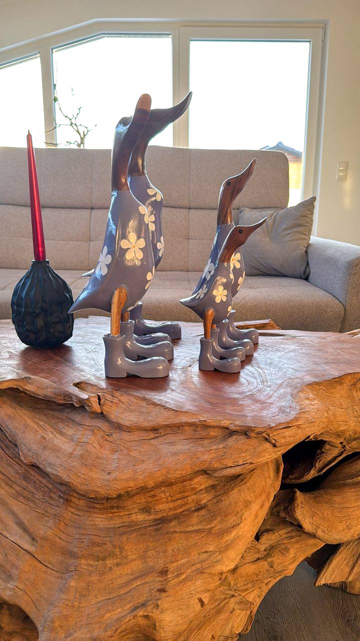 Bringen Sie einen Hauch von Eleganz in Ihr Zuhause mit dieser schönen Holzentenfamilie aus Indonesien.
