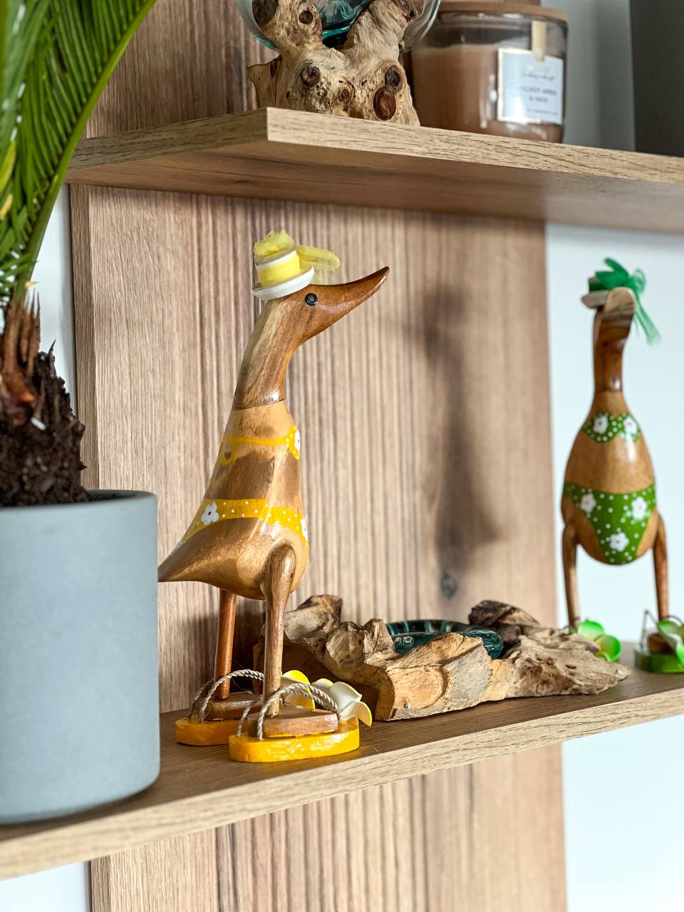 Stellen Sie diese Holzenten in Ihr Wohn- oder Schlafzimmer, um einen lebendigen Farbtupfer und dekorative Akzente zu setzen, was sie zu einem idealen Wohnaccessoire macht.