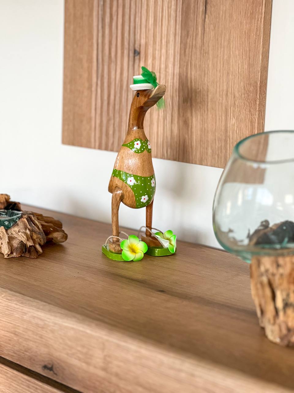 Bringen Sie einen Hauch von Eleganz in Ihr Zuhause mit dieser schönen Holzentenfamilie aus Indonesien.