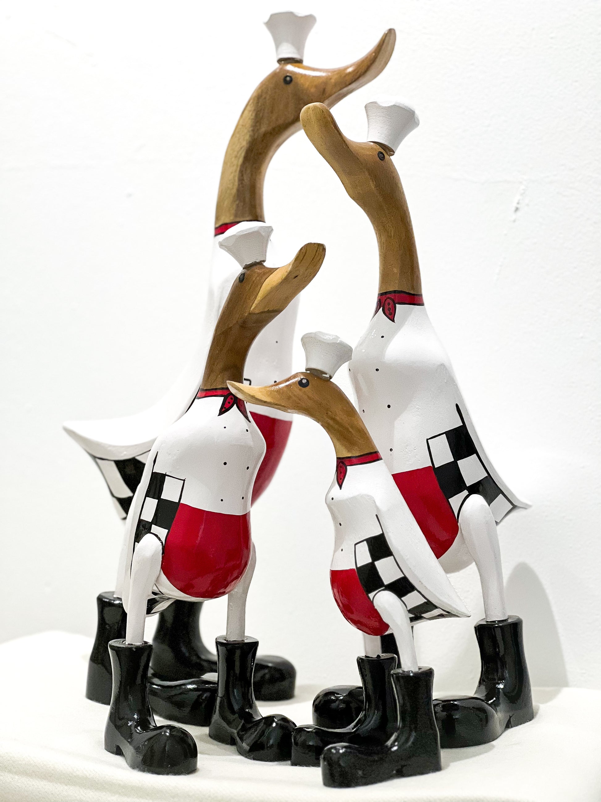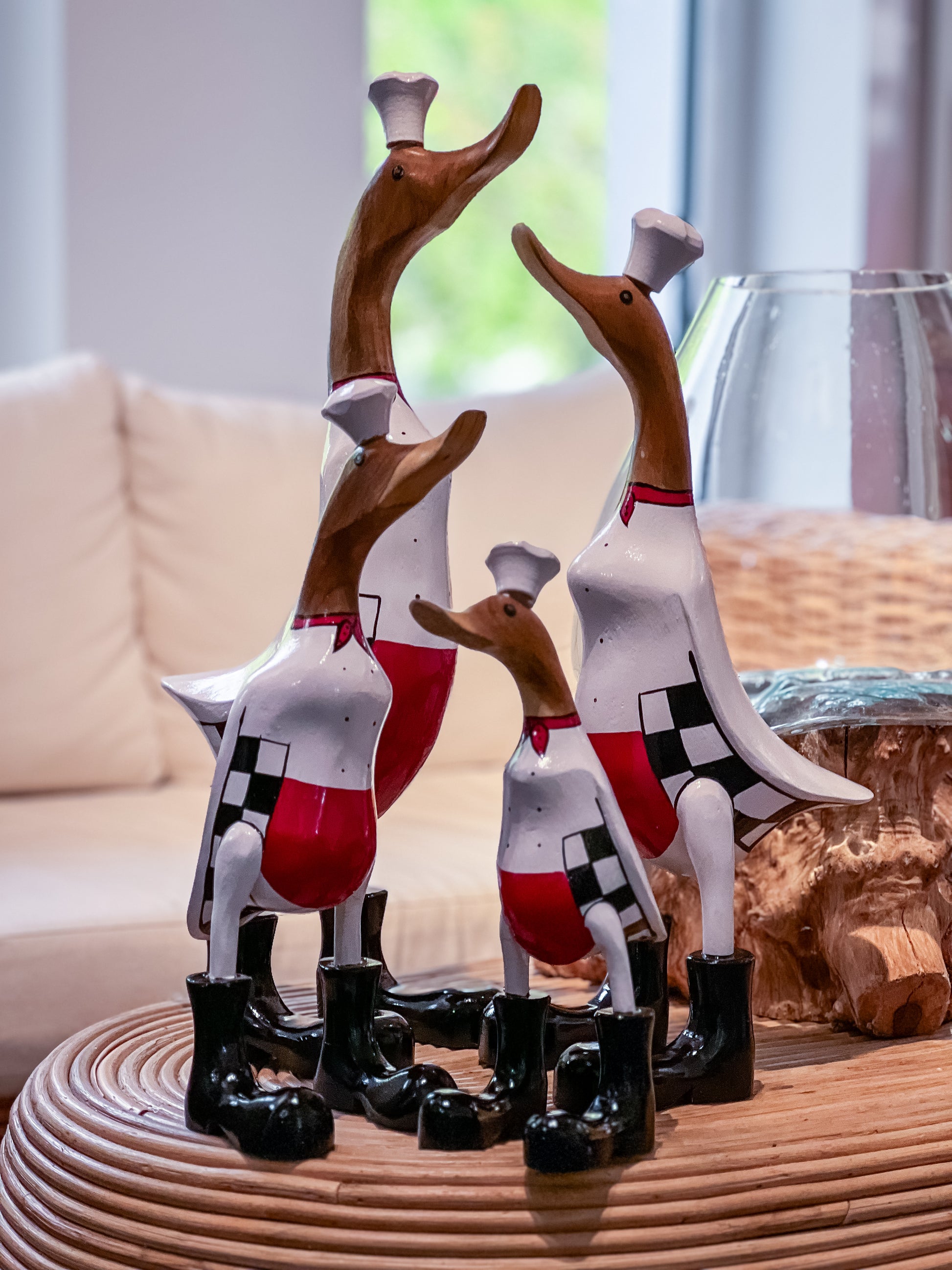 Bringen Sie einen Hauch von Eleganz in Ihr Zuhause mit dieser schönen Holzentenfamilie aus Indonesien.