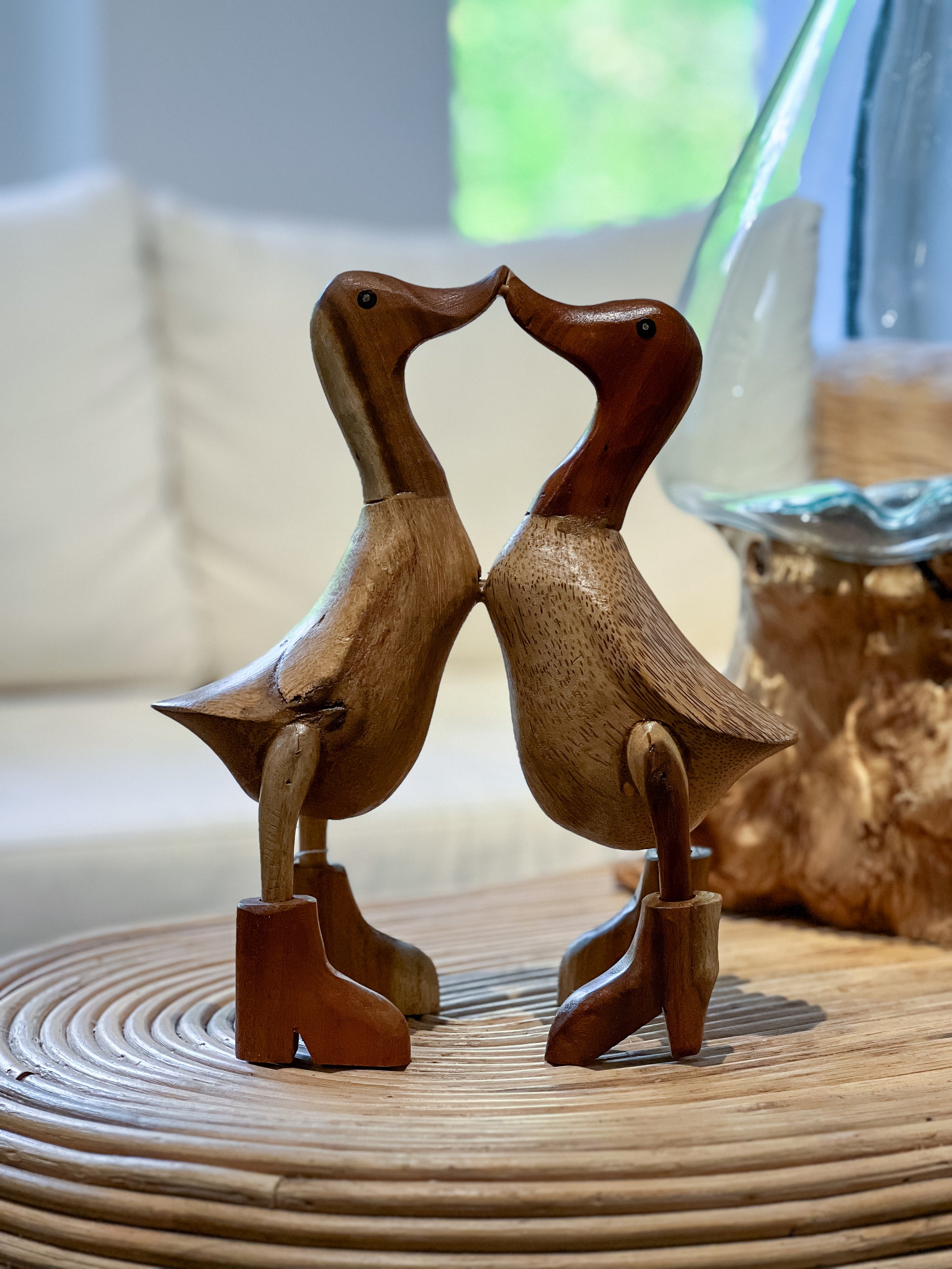 Bringen Sie einen Hauch von Eleganz in Ihr Zuhause mit dieser schönen Holzentenfamilie aus Indonesien.