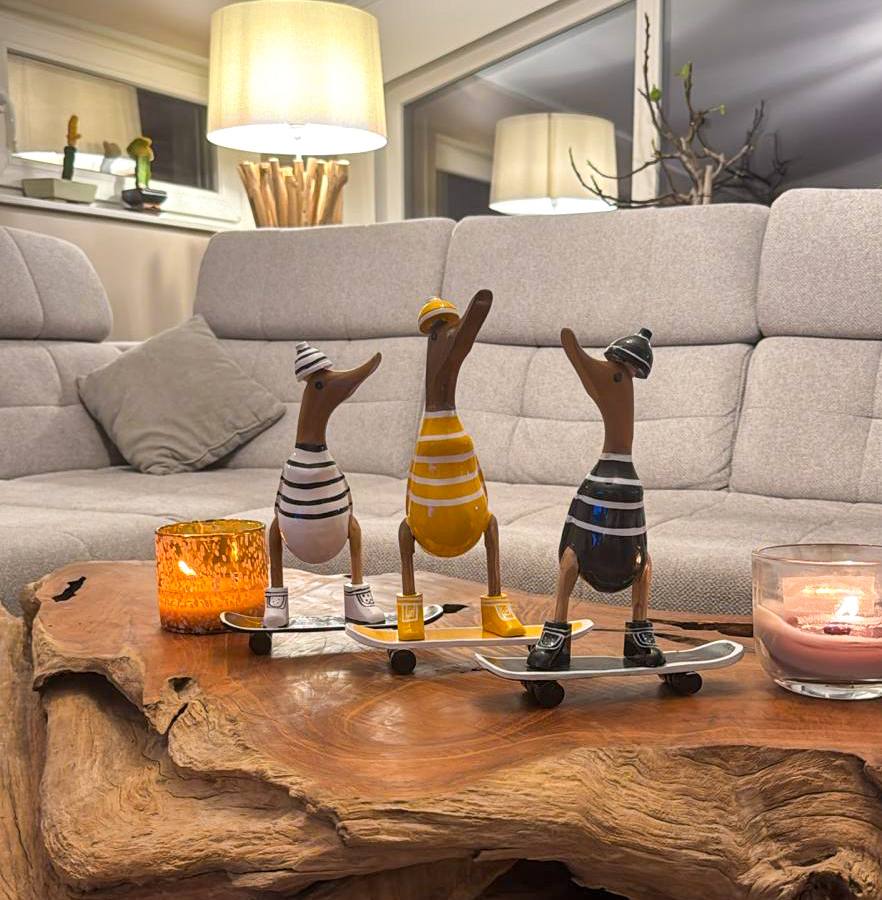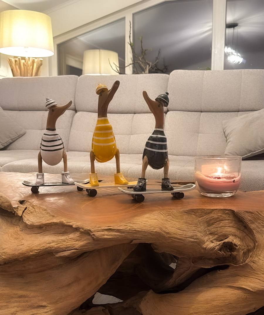 Bringen Sie einen Hauch von Eleganz in Ihr Zuhause mit dieser schönen Holzentenfamilie aus Indonesien.