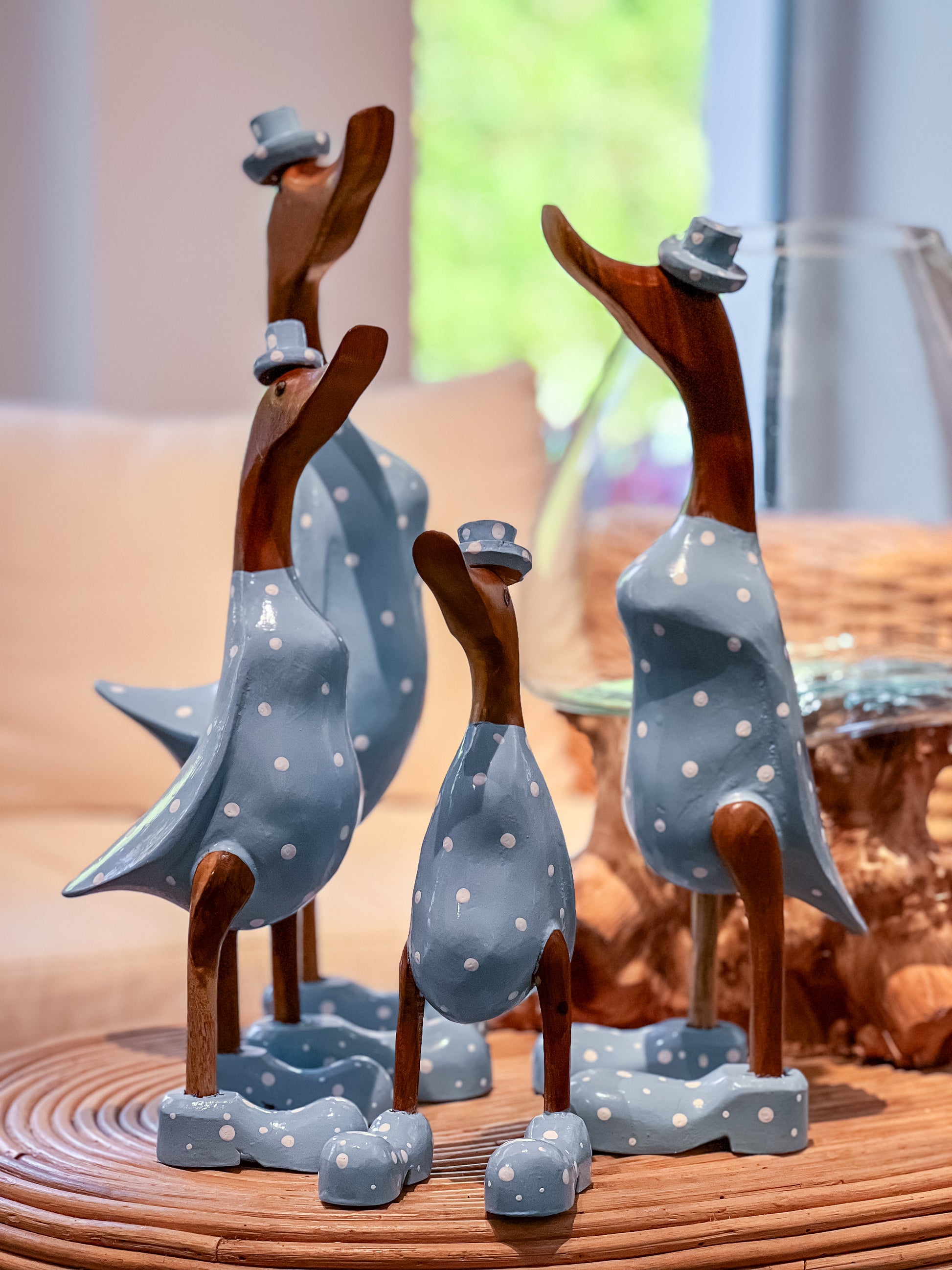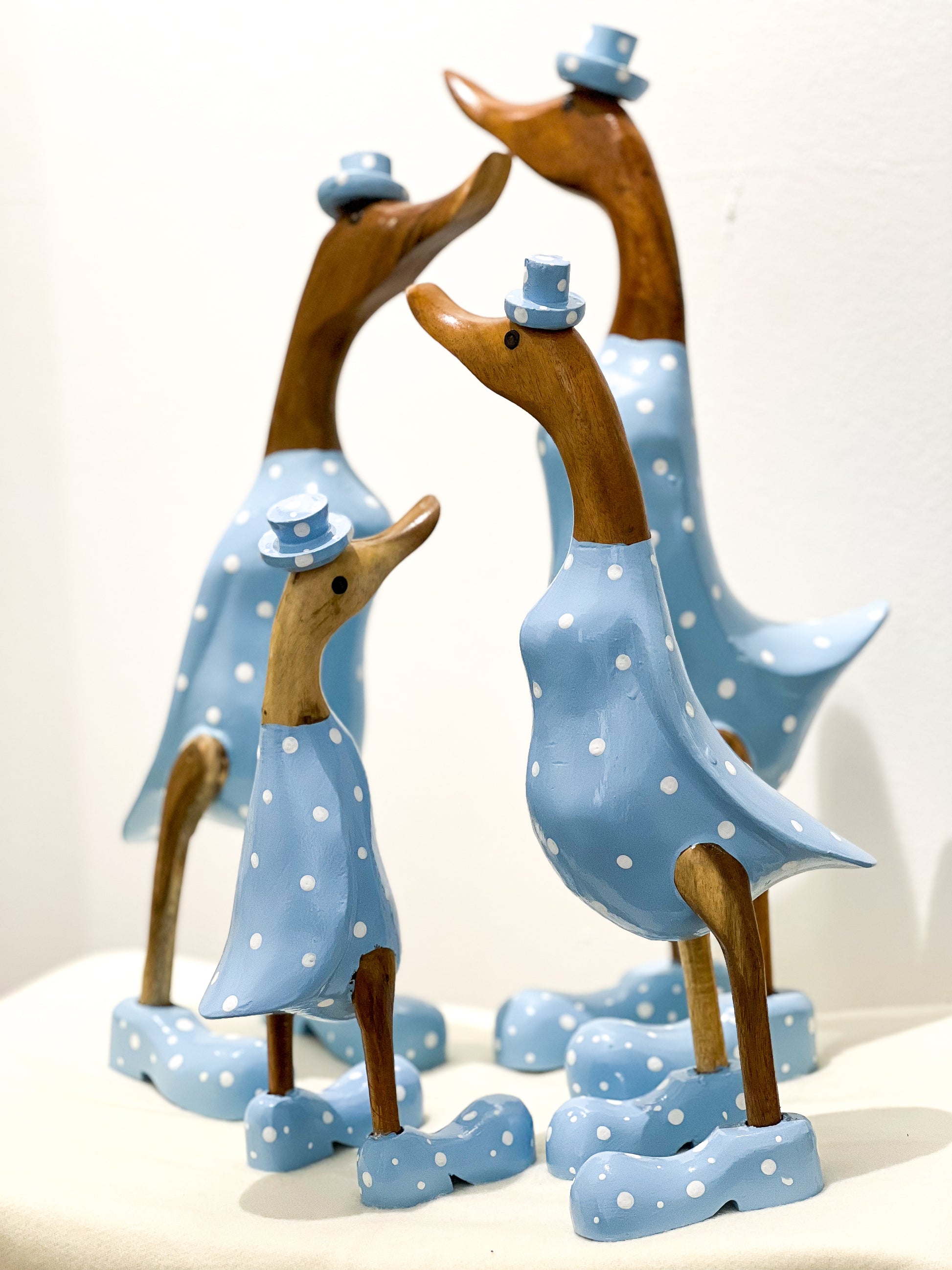 Bringen Sie einen Hauch von Eleganz in Ihr Zuhause mit dieser schönen Holzentenfamilie aus Indonesien.